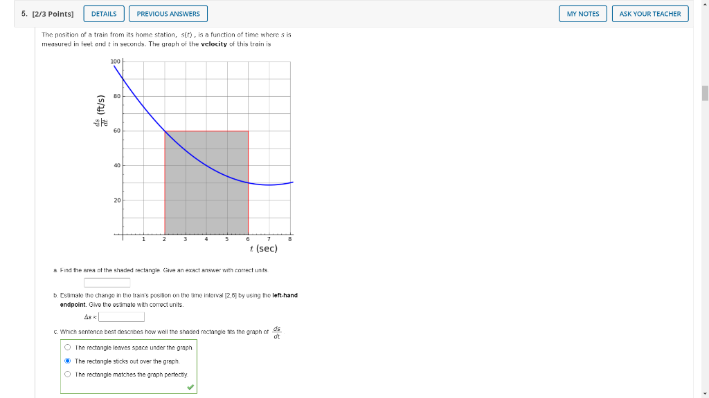 Correct answer to the question. Tarawebb03ov73nj tarawebb03ov73nj 11082017 Mathematics Middle School answered Which estimate best describes the area under the curve in square units. Lets see what we are talking about here. Area 9 chickens² I added the area units. OK here the curve y equals 2x 3 5 and here is x equals 1 and x equals 2. Now the formula for area is integral a to b of function x fx dx. My estimate of the area under the curve is about 168. The actual area is about 161. Describes the area between the velocity graph and the t-axis between t 0 and t 2 hours.