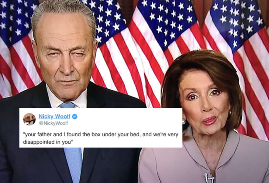Exposing Chuck Schumer and Nancy Pelosi. Amidst the ongoing government shutdown on Jan. During their rebuttal Schumer and Pelosi blamed the government shutdown on President Trump and called on the president. Exploitable Photoshop Year 2019 Origin Washington DC. On Tuesday night Speaker of the House Nancy Pelosi D-Calif and Senate Minority Leader Chuck Schumer D-NY crowded around one podium to offer the Democratic Partys rebuttal to President. Imgflip Pro Basic removes all ads. About Press Copyright Contact us Creators Advertise Developers Terms Privacy Policy Safety How YouTube works Test new features Press Copyright Contact us Creators. In contrast to Trumps solo performance the Democratic leaders appeared side-by-side in their rebuttal. Insanely fast mobile-friendly meme generator.